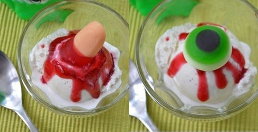 하나는 아이스크림에 빨간 시럽을 뿌리고 그 위에 손가락 모양을 얹었다. 잘린 손가락을 표현한 것.