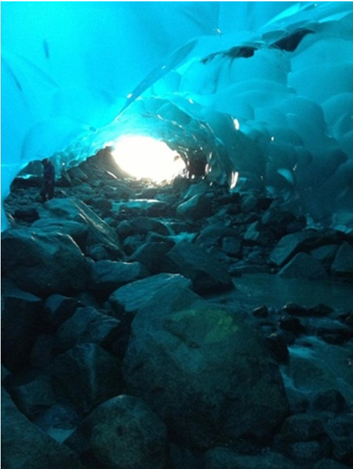이 사진은 미국 알래스카 쥬노 인근에 있는 멘델 홀 빙하에 뚫린 구멍으로 들어가 촬영한 것으로 빙하 속 55m 풍경의 모습이 담겨있다.