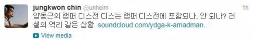 진중권은 30일 진중권은 자신의 트위터에 “양동근의 랩퍼 디스전. 디스는 랩퍼 디스전에 포함되나, 안 되나? 러셀의 역리 같은 상황”이라는 글을 올렸다.