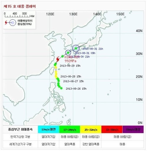 30일 기상청에 따르면, 태풍 콩레이 경로는 오후 3시께 제주도 서귀포 남남서쪽 약 490㎞ 부근 해상까지 이동한 뒤 31일 오후 3시께 일본 가고시마 북북서쪽 약 140㎞ 부근 해상을 거쳐 일본 열도를 향할 것으로 보인다.