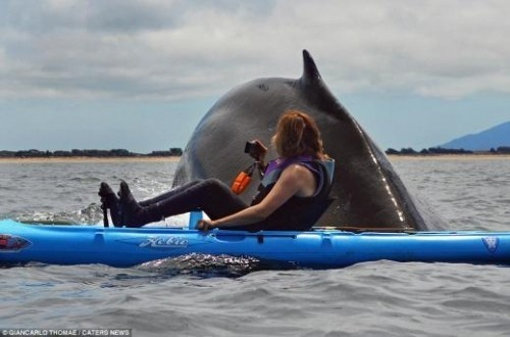 보도에 따르며, 모스랜딩해양연구소 생물학자인 지안카를로 토마에는 지난 주말 카약을 즐기다 혹등고래 무리에 둘러싸인 남녀의 사진을 찍었다고 설명했다.