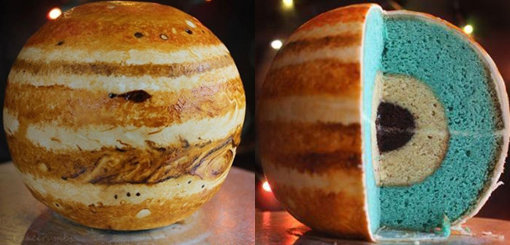 사진 속 케이크는 목성의 모양을 하고 있다. 마치 목성본처럼 보이는 이 케이크는 단면을 잘라보면 케익임을 알 수 있다.