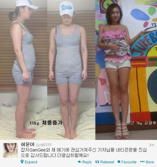 허윤아는 30일 자신의 트위터에 “잡지GanGee와 제 얘기에 관심가져주신 기자님들 네티즌분들 진심으로 감사드립니다. 더 열심히 할게요!”라는 글을 올렸다.