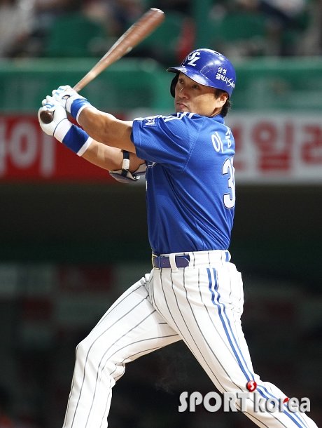 ‘2013 한국야쿠르트 세븐 프로야구’ SK 와이번스와 삼성 라이온즈의 경기가 30일 오후 인천 문학야구장에서 열렸다. 7회초 2사 1,2루에서 삼성 이승엽이 1타점 적시타를 치고 있다.