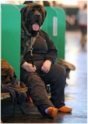 사진에는 검은 개가 사람처럼 의자에 걸터 앉아 자신의 목줄을 잡고 있는 모습이 보인다. 그러나 자세히 보면 이 개는 주인을 가리고 있어 착시 효과를 일으킨 것을 알 수 있다.