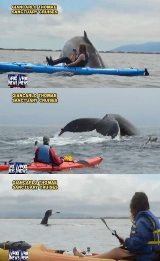 보도에 따르면, 토마에는 지난 주말 친구들과 카약을 즐기던 중 거대 혹등고래를 발견했다.