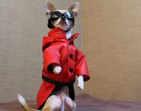 공개된 사진 속 개는 선글라스를 낀 채 붉은색 트렌치 코트를 입고 한껏 멋을 내 보이고 있다.