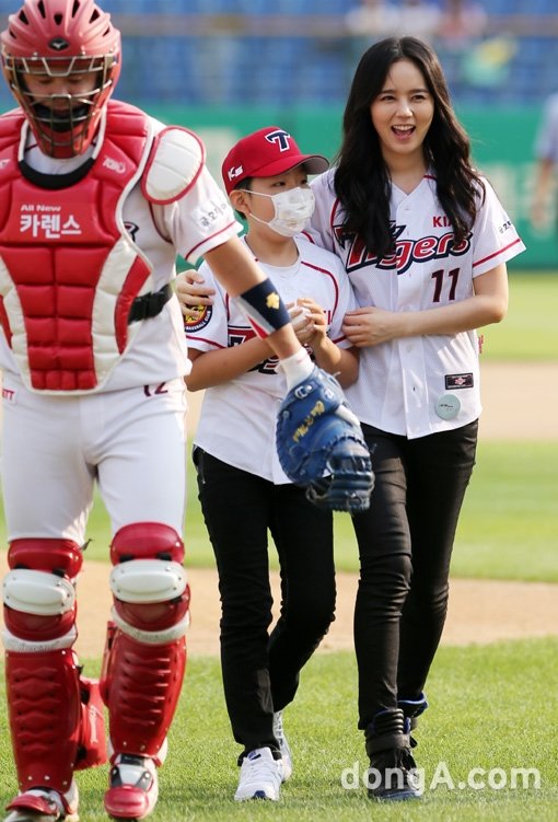 배우 한가인이 1일 오후 광주 무등경기장에서 열린 프로야구 KIA 타이거즈와 NC 다이노스의 경기에 앞서 시구 도우미를 자청해 어린이와 그라운드 밖으로 나서고 있다.