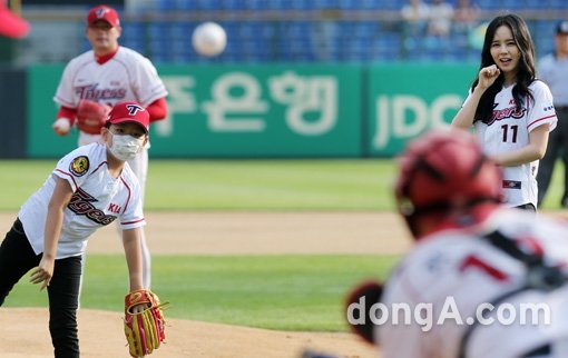 배우 한가인이 1일 오후 광주 무등경기장에서 열린 프로야구 KIA 타이거즈와 NC 다이노스의 경기에 앞서 시구 도우미를 자청해 어린이의 시구를 바라보고 있다. 이날 시구는 ‘보해 힐링의 날’을 맞아 소아암을 극복한 박철민 군이 맡았고, (주)보해의 임효섭 대표이사 시타를 했다. 한가인은 보해 월소주의 모델로 활동 중이다.