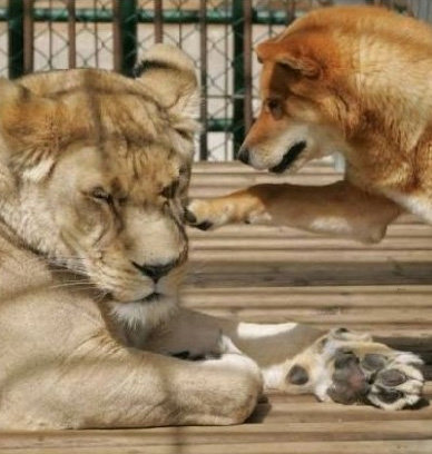 사진 속에는 사자와 강아지의 아찔한 모습이 담겨 있다. 마주 보는 것만으로도 무서울 법한 사자 앞에서 강아지는 앞발로 사자의 얼굴을 슬쩍 건드리고 있다.