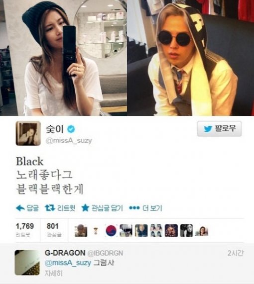 그룹 빅뱅 멤버 지드래곤과 그룹 미쓰에이 멤버 수지의 트위터 대화가 화제다.