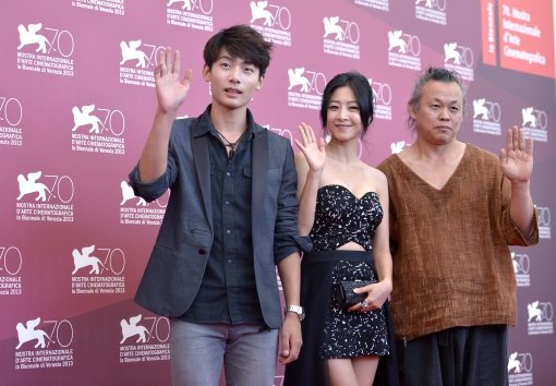 제70회 베니스국제영화제 비경쟁 부문에 진출한 영화 ‘뫼비우스’의 주인공 서영주, 이은우와 연출자 김기덕 감독(왼쪽부터). 한국시간으로 3일 오후 열린 공식 상영에 앞서 취재진 앞에서 포즈를 취하고 있다. 사진제공|김기덕필름