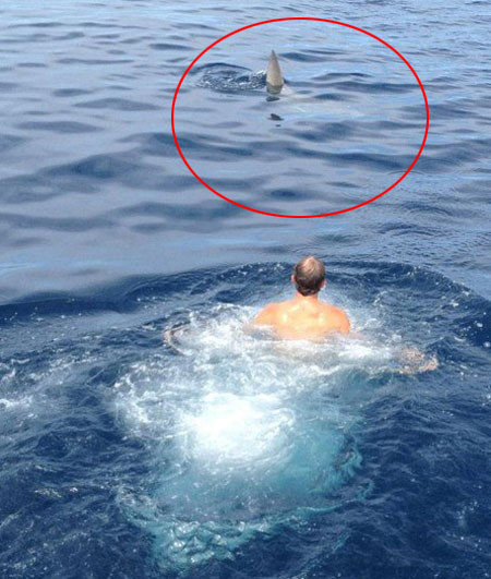 이 사진에는 바다에서 수영을 하고 있는 남자 앞으로 상어의 지느러미가 보인다. 게시자는 “남자가 보트에서 뛰어내려 수영을 즐기고 있는데 그를 향해 상어가 다가왔다”고 설명했다.