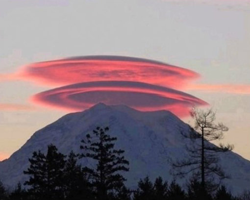 이 사진에서는 산 위에 붉게 퍼진 구름의 모양을 볼 수 있다. 이 모습이 마치 UFO를 닮아 있어 시선을 모은 것.