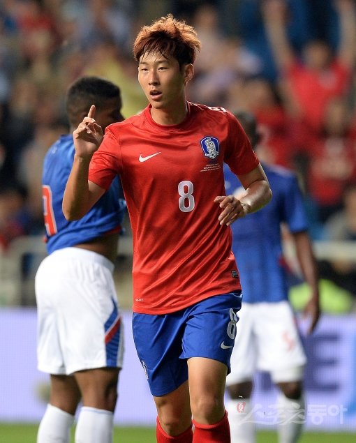 5일 인천축구전용경기장에서 한국 축구대표팀 대 아이티(세계랭킹 74위)의 평가전이 열렸다. 한국 손흥민이 전반전 선제골을 성공시킨 후 환호하고 있다.