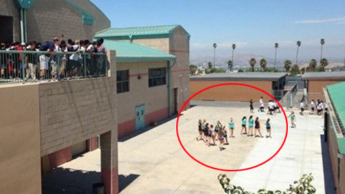 사진에는 한 건물의 테라스에 떼로 몰려 있는 남자들의 모습이 담겨 있다. 그리고 그들이 일제히 바라보고 있는 곳은 바로 치어리더들의 연습 현장.