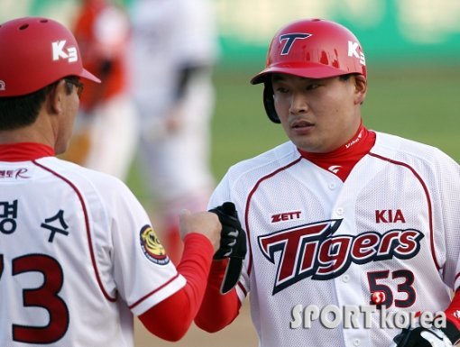 8일 오후 광주 무등야구장에서 열린 ‘2013 한국 야쿠르트 세븐 프로야구’ KIA 타이거즈와 한화 이글스의 경기 3회말 1사 1, 2루 상황에서 KIA 이종환이 동점 적시타를 때린 후 이명수 코치와 기쁨을 나누고 있다.