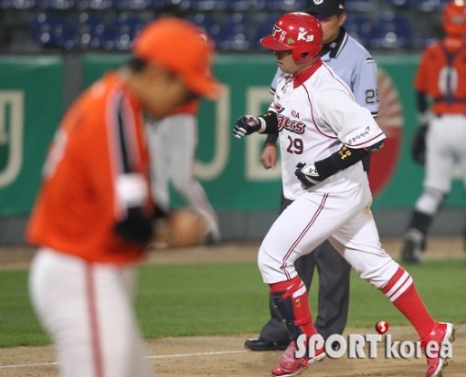 8일 오후 광주 무등야구장에서 열린 ‘2013 한국 야쿠르트 세븐 프로야구’ KIA 타이거즈와 한화 이글스의 경기 7회말 1사 상황에서 KIA 나지완이 솔로포를 터뜨린 후 그라운드를 돌고 있다.