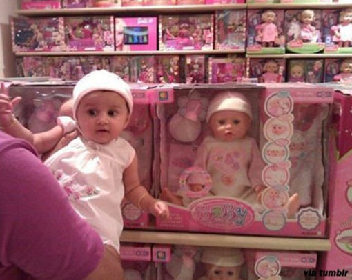 사진에는 한 장난감 가게에 있는 아기 인형과 실제 아기를 비교해 놓았는데 그 모습이 도플갱어 처럼 닮아 있어 눈길을 끈다.