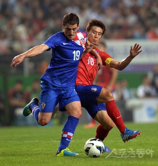 한국 축구대표팀이 10일 전주월드컵경기장에서 크로아티아(FIFA랭킹 8위)와 평가전를 가졌다. 한국 구자철과 크로아티아 아리안 아데미가 볼다툼을 하고 있다.