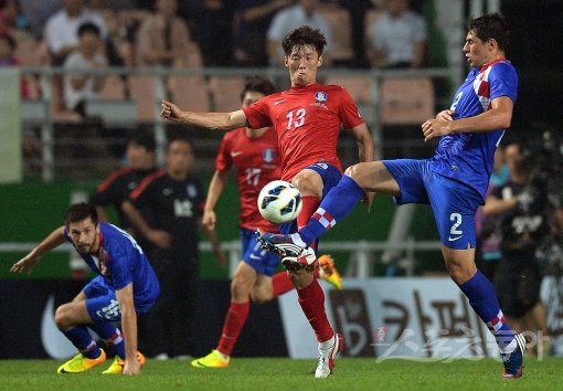한국 축구대표팀이 10일 전주월드컵경기장에서 크로아티아(FIFA랭킹 8위)와 평가전를 가졌다. 한국 김보경과 크로아티아 수비수가 볼다툼을 하고 있다.