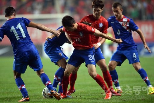 한국 축구대표팀이 10일 전주월드컵경기장에서 크로아티아(FIFA랭킹 8위)와 평가전를 가졌다. 한국 윤석영이 크로아티아 선수들 사이에서 볼다툼을 하고 있다.