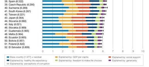 한국은 총 6.267점으로 전체 41위를 기록했다. 이는 동아시아 유교문화권에서는 가장 높은 행복도다. 한국의 뒤를 이어 대만이 42위(6.221점), 일본이 43위(6.064점)에 올랐다. 북한은 조사 대상국에 포함되지 않았다.