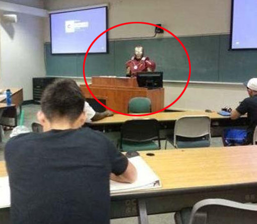 대학 강의실 풍경을 찍은 이 사진에는 정말로 아이언맨 수트를 입은 사람(?)이 서 있어 시선을 모은다.