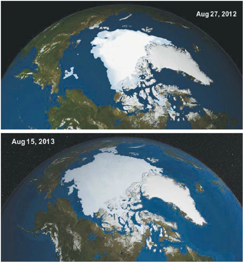 공개된 사진을 보면 실제로 북극의 빙하 면적이 눈에 띄게 증가한 것을 확인할 수 있다. 이는 유럽 대륙의 절반 크기에 해당하는 면적으로 알려졌다.