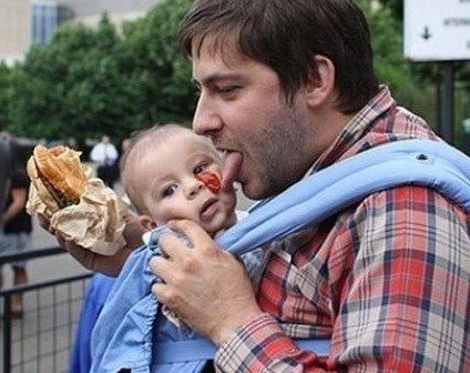 사진에는 아이를 안고 있는 아빠의 모습이 보인다. 이 아빠는 햄버거를 먹다가 아이의 얼굴에 케첩을 흘리자 이를 휴지가 아닌 혀로 닦아주고 있다.