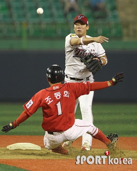 KIA 안치홍이 11일 오후 군산 월명야구장에서 열린 ‘2013 한국야쿠르트 세븐 프로야구’ KIA 타이거즈와 SK 와이번스와의 경기, 3회초 1사 만루에서 SK 최정의 내야땅볼을 토스받아 1루주자 조동화를 포스아웃 시킨 후 1루에 송구해 더블플레이를 만들고 있다.