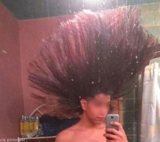 우산 필요 없는 남자 사진 속 한 남성은 붉은색 긴 머리가 하늘을 향해 치솟도록 만든 뒤 거울에 비친 자신의 모습을 촬영하고 있다.