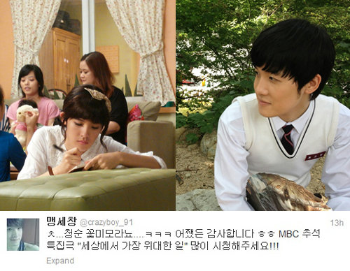 맹세창은 12일 자신의 트위터에 “청순 꽃미모라뇨… 어쨌든 감사합니다. MBC 추석 특집극 ‘세상에서 가장 위대한 일’ 많이 시청해주세요!”라는 글을 남겼다.