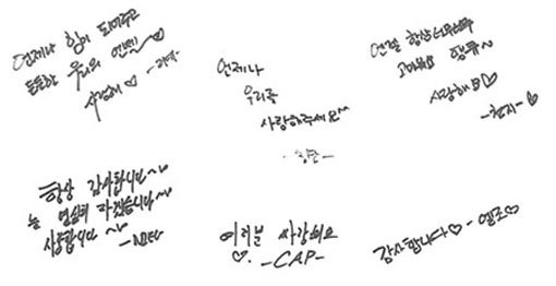 멤버 리키는 “언제나 힘이 되어주고 든든한 우리의 엔젤 사랑해”라고 메시지를 전했고, 천지는 “엔젤 항상 너무너무 고마워요, 땡큐. 사랑해요”, 니엘은 “항상 감사합니다. 늘 열심히 하겠습니다. 사랑합니다”, 창조는 “언제나 우리를 사랑해주세요”, 캡과 엘조 역시 감사의 메시지를 남기는 등 팬들의 사랑에 감사하는 마음을 손글씨로 표현했다.