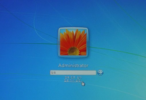 제대로 암호 재설정 디스크가 만들어졌는지 확인해 볼 시간이다. 윈도 암호 입력 시 일부러 틀린 암호를 입력해 보았다. 그러면 암호 입력 칸 아래에 ‘암호 다시 설정’ 메뉴가 나타난다.
