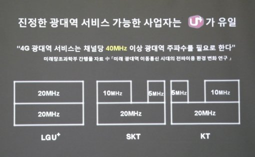 LG유플러스 이창우 부사장은 "진정한 광대역 LTE는 LG유플러스만 가능하다. 4G 광대역 서비스는 채널당 40MHz 이상 광대역 주파수를 필요로 하기 때문이다"라며, "고속도로에 비유하자면 LG유플러스는 4차선 고속도로 100% 광대역 LTE를 제공할 수 있다"고 설명했다. 현재 LG유플러스는 국내에서 가장 많은 LTE 주파수 대역(3밴드, 80MHz)를 확보했다.