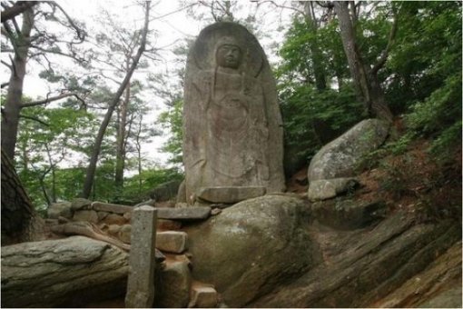 통일신라시대에 조성된 합천 해인사 마애불 입상은 보물 제222호. 가야산 해발 1000m 지점 길옆 바위에 양각으로 새겨졌다. 높이만 7.5m, 너비는 3.1m 크기다.