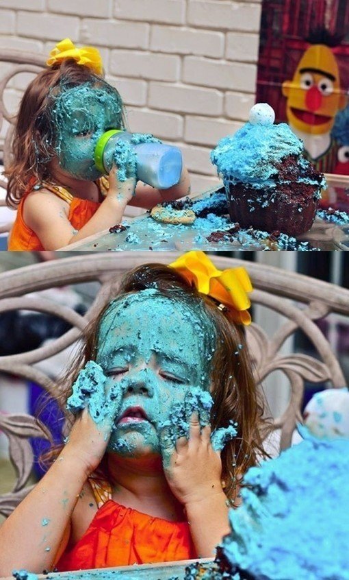 사진 속에는 한 외국인 소녀가 케이크를 먹다 파란색 크림을 얼굴에 잔뜩 묻힌 장면이다. 이 소녀는 이내 아예 두 손으로 크림을 자신의 얼굴에 덕지덕지 바르기까지 한다.