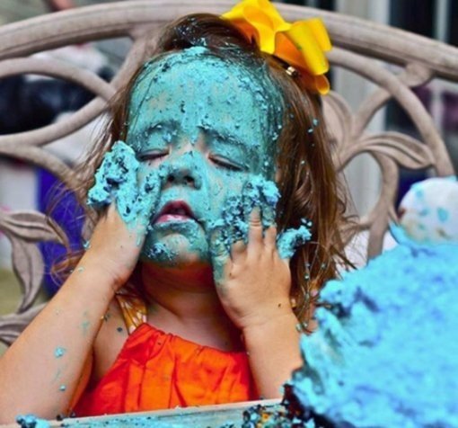 공개된 ‘케이크와 싸운 소녀’ 사진에는 한 소녀가 파란색 케이크 크림을 얼굴 전체에 묻힌 채 태연한 표정을 짓고 있는 모습이 담겨 있다.