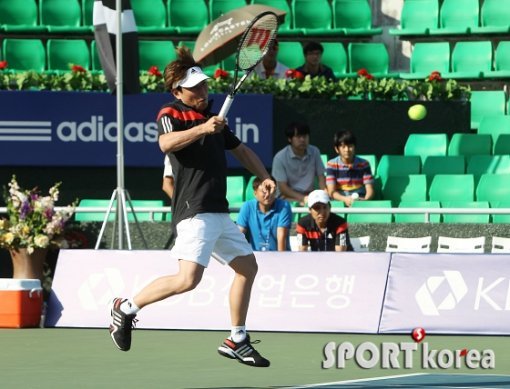 15일 오후 서울 방이동 올림픽공원 테니스 센터 코트에서에서 열린 ‘아디다스 프렌즈 매치’에서 가수 윤종신이 리시브를 하고 있다.