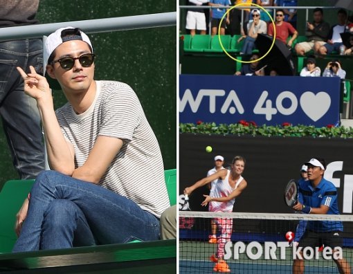 배우 조인성이 15일 오후 서울 올림픽공원 체조경기장에서 열린 ‘윤종신 전미라 부부 대 마리아 키릴렌코 이재훈 이색 테니스 대회’에 참석해 관중석에서 깜찍 브이를 그리고 있다.