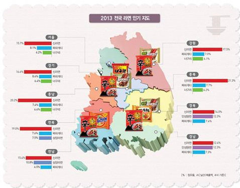농심은 15일 ‘2013 전국 라면 인기지도’ 보고서를 제작, 발표했다. 이 보고서는 농심이 한국 라면 출시 50주년을 맞이해 올해 1∼7월 AC닐슨이 분석한 자료를 토대로 만든 것.