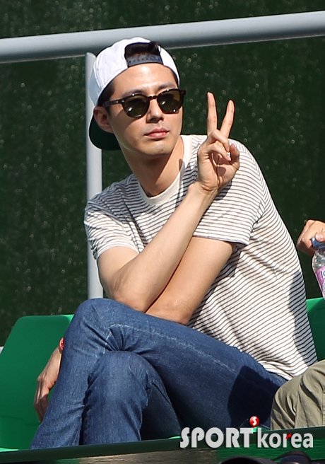 배우 조인성이 15일 오후 서울 올림픽공원 체조경기장에서 열린 ‘윤종신 전미라 부부 대 마리아 키릴렌코 이재훈 이색 테니스 대회’에 참석해 관중석에서 깜찍 브이를 그리고 있다.