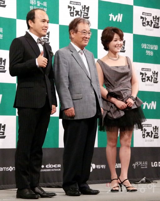 tvN 새 일일시트콤 <감자별 2013QR3>(이하 감자별) 제작발표회가 16일 서울 강남구 임피리얼 팰리스 호텔에서 열렸다. 시트콤에 출연한 (왼쪽부터) 김광규, 이순재, 오영실이 포토 타임을 갖고 있다.