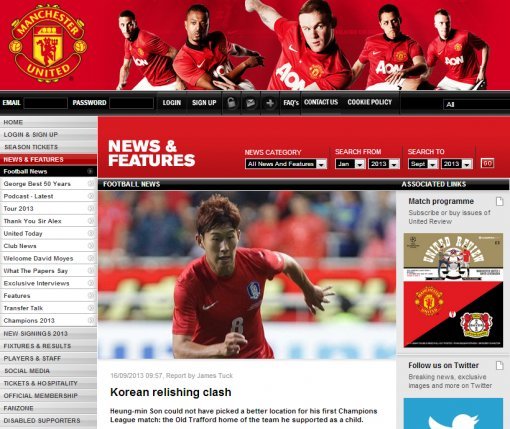 맨체스터 유나이티드(이하 맨유)가 바이엘 레버쿠젠과의 2013~2014 챔피언스리그 조별리그 A조 1차전을 앞두고 공식 홈페이지를 통해 손흥민(21·레버쿠젠)을 자세히 소개해 눈길을 끌었다.