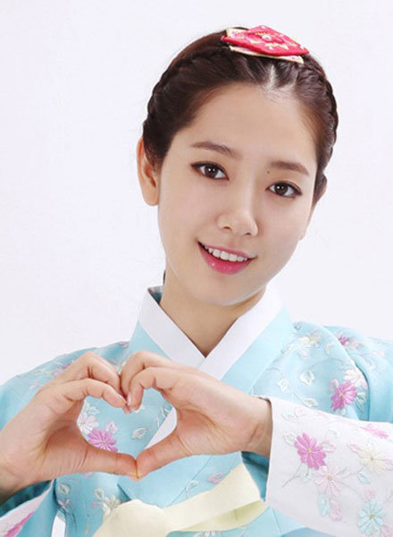 사진 속 박신혜는 광고 촬영 중 한복을 입고 손으로 하트를 그리며 단아한 모습으로 방긋 웃고 있다.
