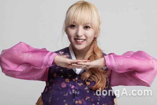 걸그룹 헬로비너스가 민족 고유의 명절 추석을 맞아 한복을 입고 인터뷰에 나섰다. 멤버 윤조가 인터뷰에 앞서 포즈를 취하고 있다