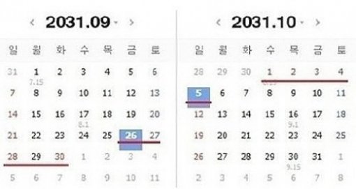 공개된 사진은 2031년 추석 연휴가 담긴 달력의 모습이다. 해당 달력을 보면 2031년 추석은 9월 30일부터 시작해 10월 2일에 끝이 난다. 이어 10월 3일 개천절이며, 4·5일 주말까지 합치면 총 6일간 쉴 수 있다. 9월 29일만 휴가를 내면 최장 9일간 황금연휴를 만끽할 수 있는 것.