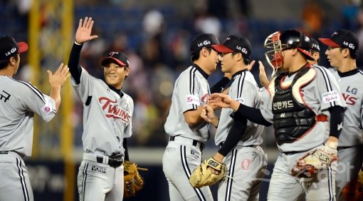 22일 오후 창원 마산야구장에서 ‘2013 한국야쿠르트 세븐 프로야구’ NC 다이노스와 LG 트윈스의 경기가 열렸다. LG가 NC에 6-1로 승리한 뒤 선수들이 그라운드에서 기쁨을 나누고 있다.
