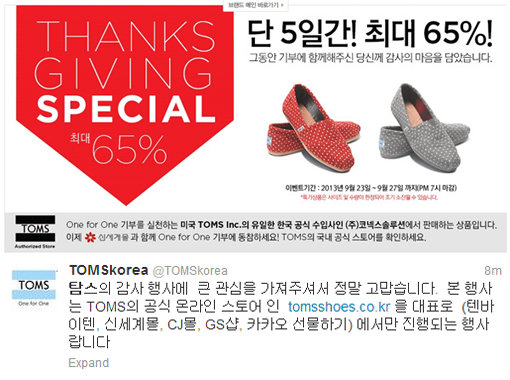 이에 ‘탐스코리아’는 공식 트위터를 통해 “탐스의 감사 행사에 큰 관심을 가져주셔서 정말 고맙습니다. 본 행사는 TOMS의 공식 온라인 스토어 인 http://www.tomsshoes.co.kr 을 대표로 (텐바이텐, 신세계몰, CJ몰, GS샵, 카카오 선물하기) 에서만 진행되는 행사랍니다”라는 글을 남겼다.